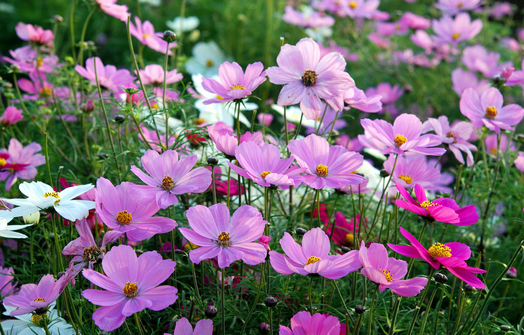 波斯菊又名:秋英、秋櫻、八瓣梅、掃帚梅,為一年生草本植物,細(xì)莖直立,分枝較多,光滑莖或具微毛。單葉對(duì)生,頭狀花序著生在細(xì)長(zhǎng)的花梗上,頂生或腋生,花莖5~8cm。舌狀花l輪,花瓣尖端呈齒狀,花瓣8枚,有白、粉、深紅色。筒狀花占據(jù)花盤中央部分均為黃色?;ㄆ谙?、 秋季。